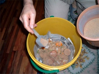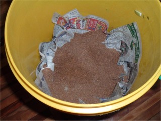 | 2. 発酵用バケツの中底(目皿)に新聞紙を敷き、その上にEMボカシを一握り撒きます。 |