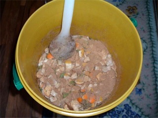 | 4. EMボカシと生ゴミが均等に混ざるように丁寧に混ぜます。 |